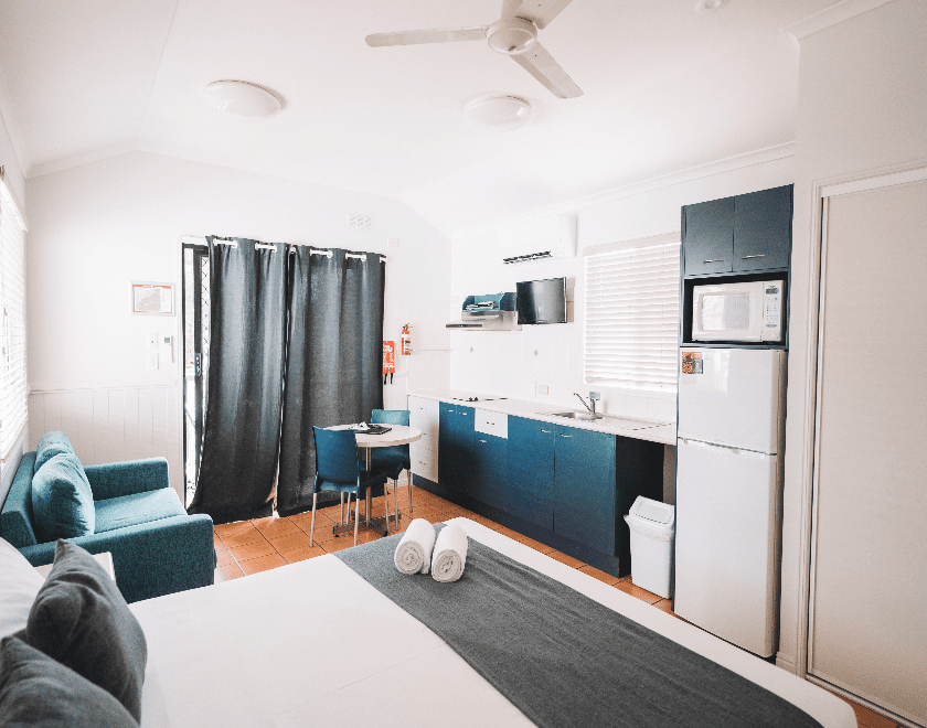 Escape the stress of everyday reality – plan an escape for you and your partner and enjoy a stay in one of our studio cabins while exploring Rainbow Beach. Sleeping up to 2 people, this cabin is well-suited for couples or solo travellers. Featuring a king bed, you’ll have plenty of room to stretch out for a good night's sleep. Being fully self-contained, you’ll be able to enjoy preparing meals in the comfort of your cabin as the kitchenette is equipped with a cook top, microwave, refrigerator and your basic cooking utensils. We have select dog-friendly cabin options available. Please notify us if you are bringing a dog. Additional charges apply.